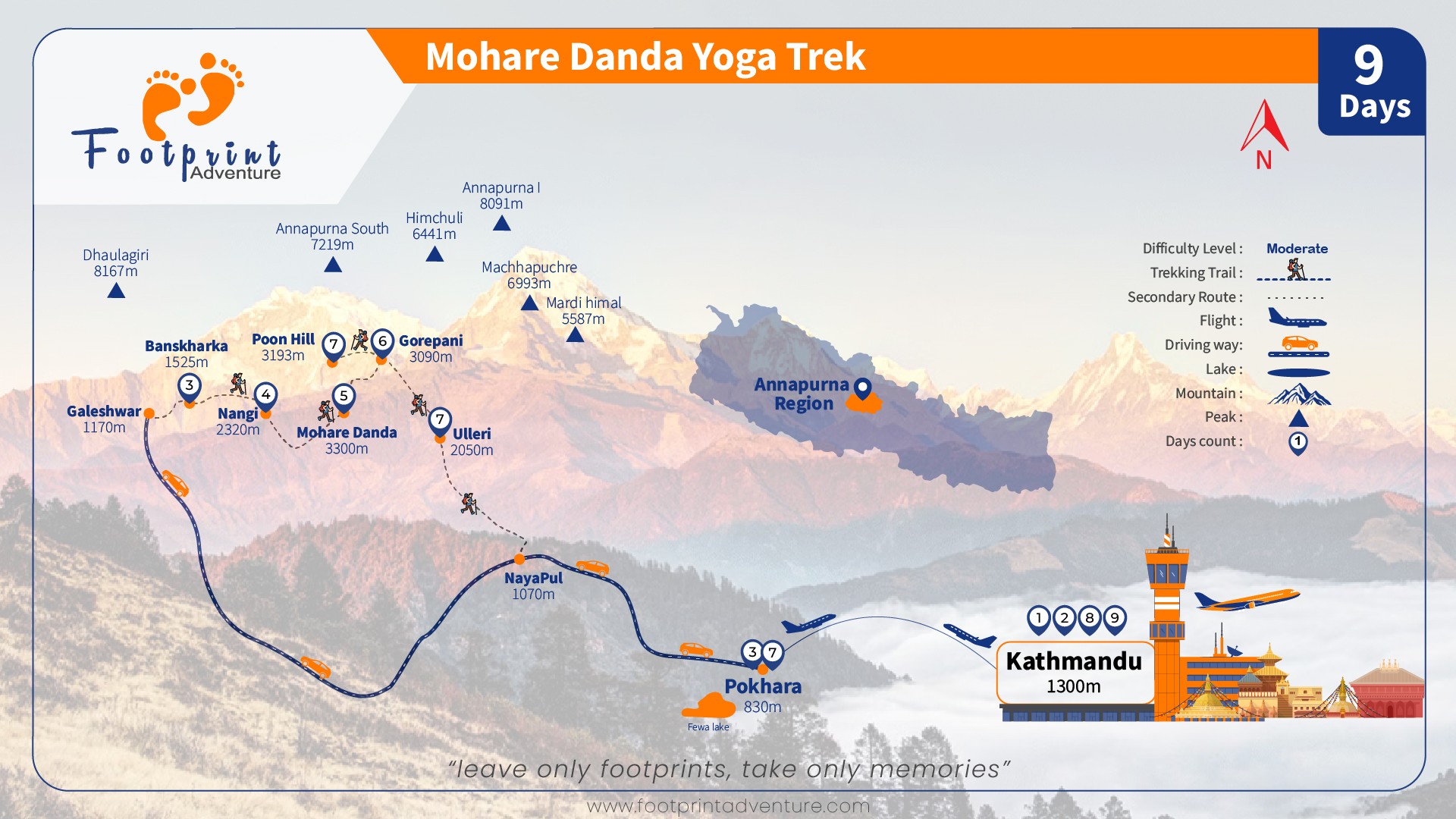 The trekking route begins with a cultural tour in Kathmandu before flying to Pokhara and driving to Galeshwor. From there, the trail leads you through orange-growing villages like Banskharka and the community-focused village of Naangi. The climb to Mohare Danda (3,300 m), the highest point of the trek, takes you through beautiful rhododendron forests. From the top, you can enjoy breathtaking sunrise and sunset views of the Himalayas making it an ideal setting for yoga and meditation. After Mohare Danda, the trail descends to Ghorepani and continues to the famous Poon Hill viewpoint for another stunning sunrise before returning to Pokhara.